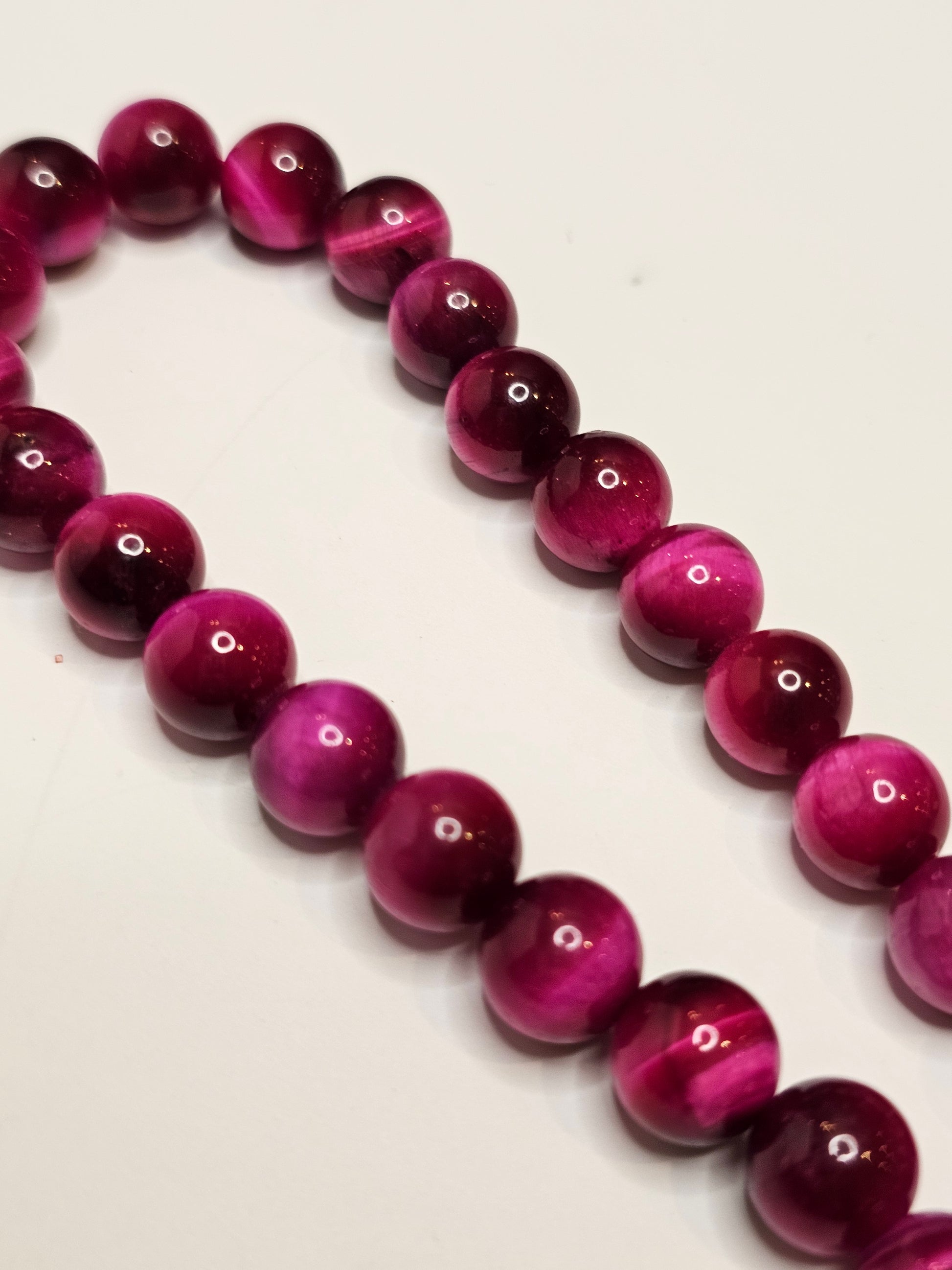 Fushia Tiger's Eye gemstone offers a unique and vibrant hue of deep pink and purple. Its mesmerizing luster and chatoyancy make it a stunning addition to any jewelry collection. Add a touch of elegance and individuality to your style with Fushia Tiger's Eye.