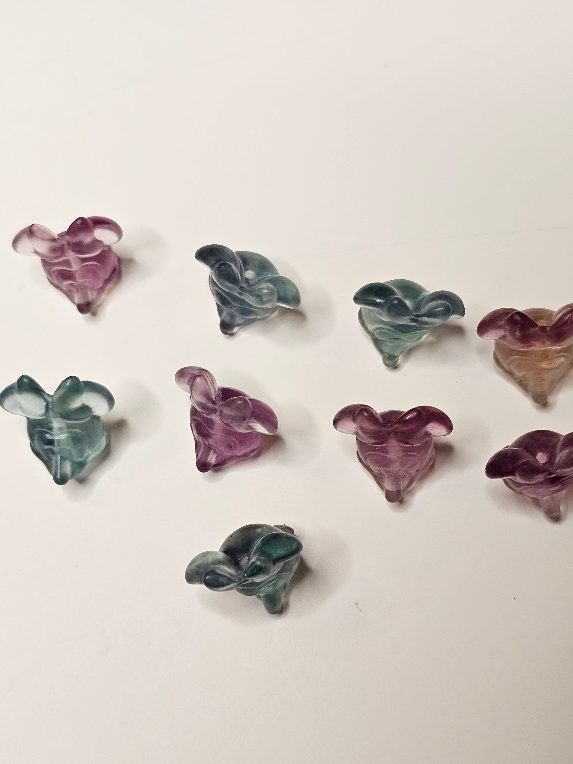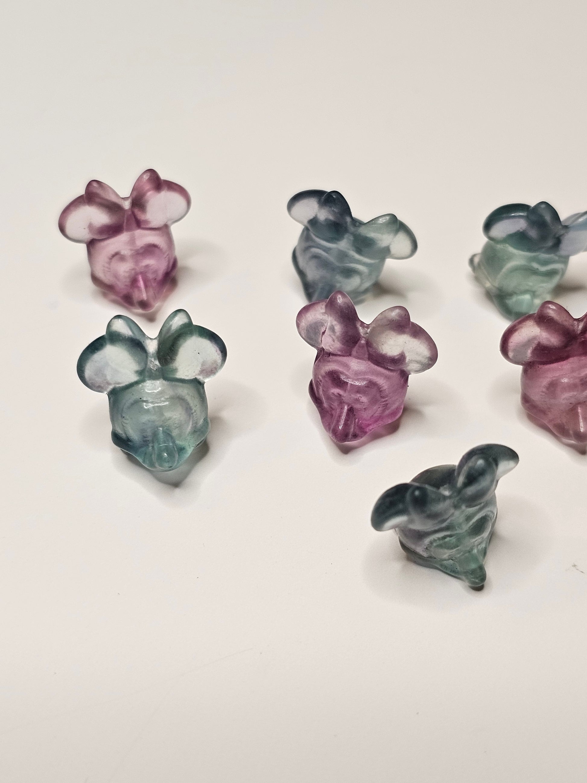 Add a touch of quirkiness to your charm collection with our Girl Mouse Flourite Charm! This unique charm features an adorable girl mouse design and is made of flourite, known for its calming and balancing properties. A playful addition to any outfit, this charm is sure to bring a smile to your face (and your wrist)!
