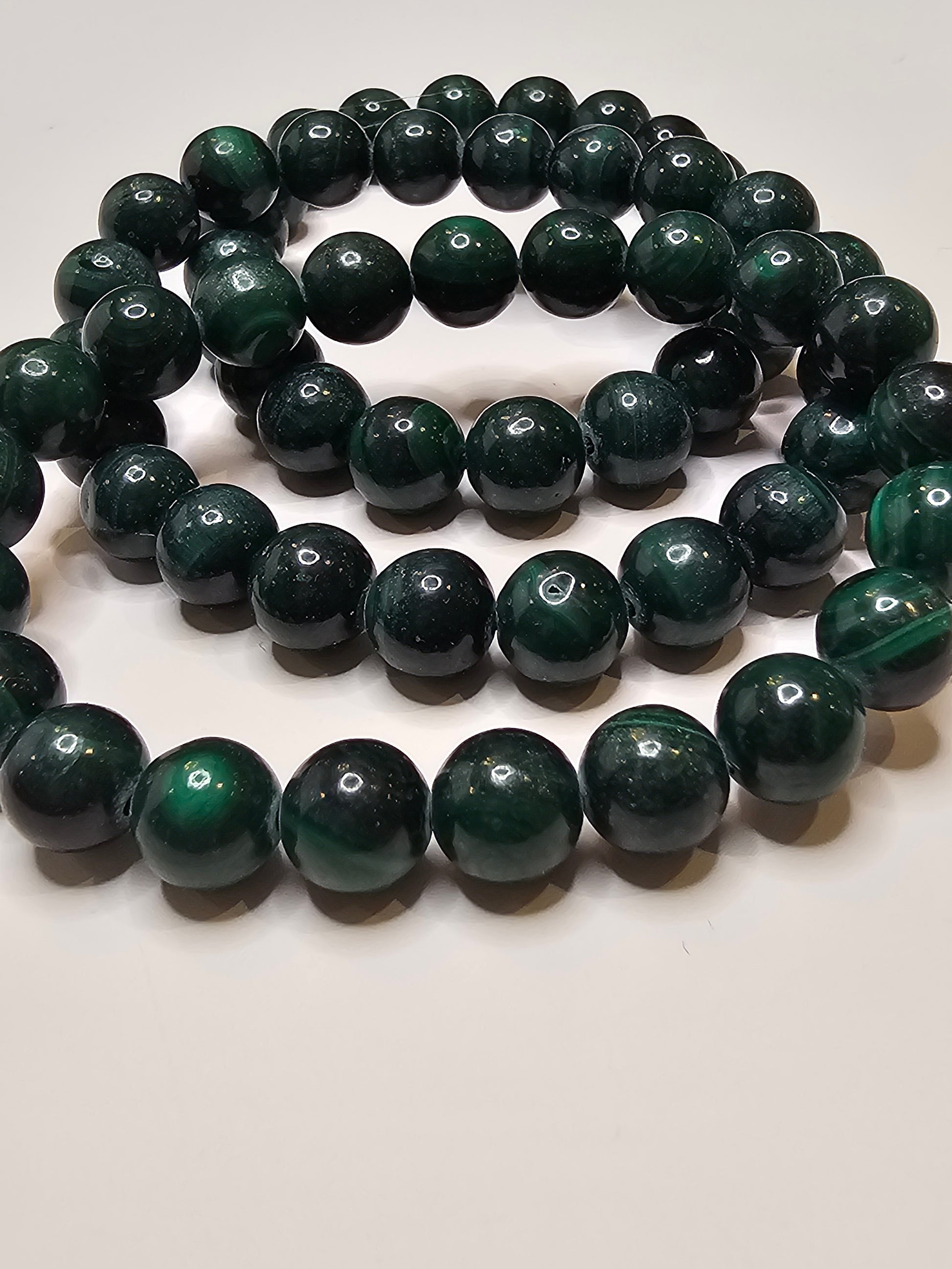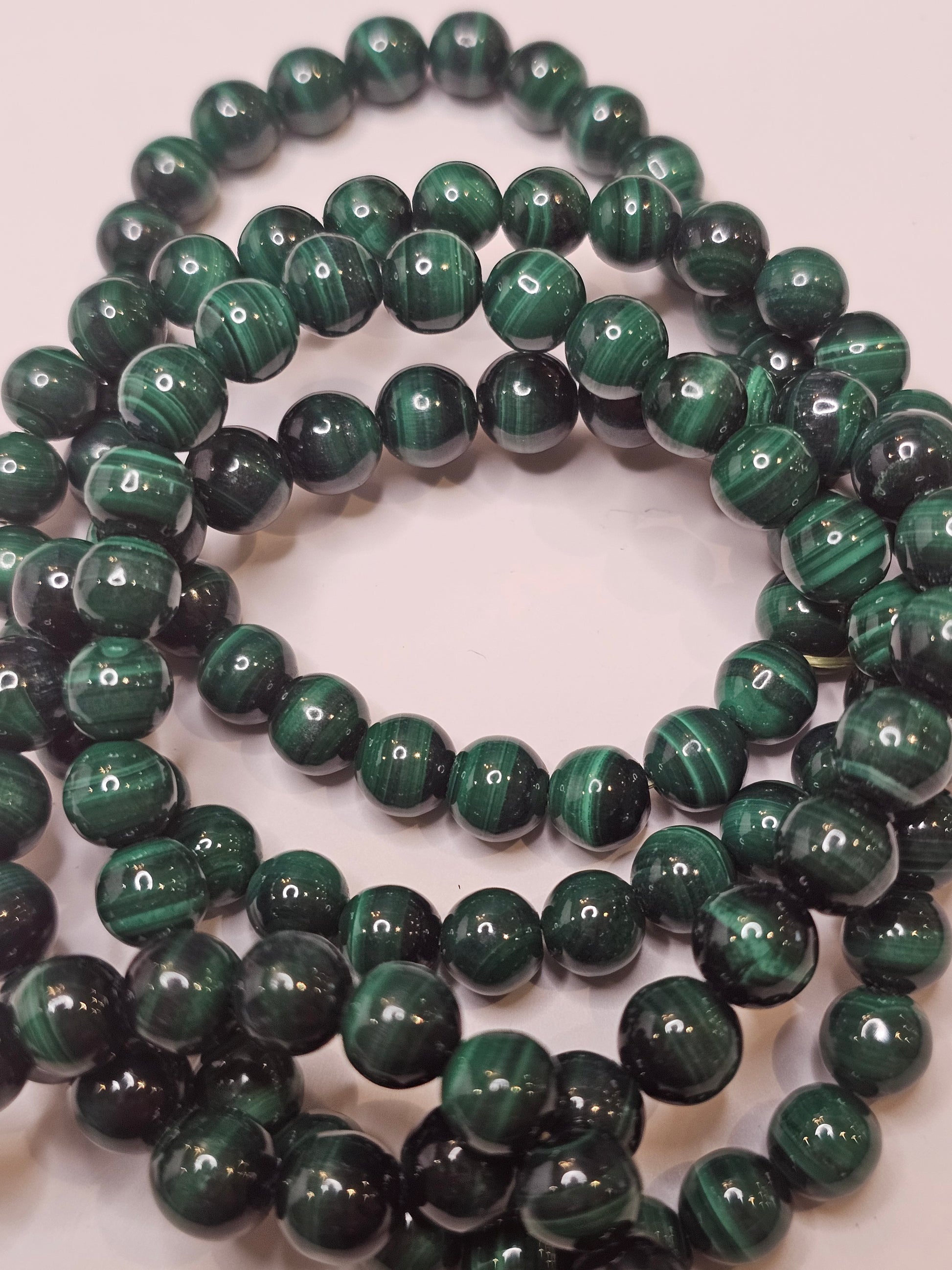 This Malachite bracelet boasts a stunning green hue thanks to the natural gemstone, giving it a timeless and elegant look. The bracelet can also be used as a healing stone due to its high copper content. A beautiful and beneficial addition to any jewelry collection.