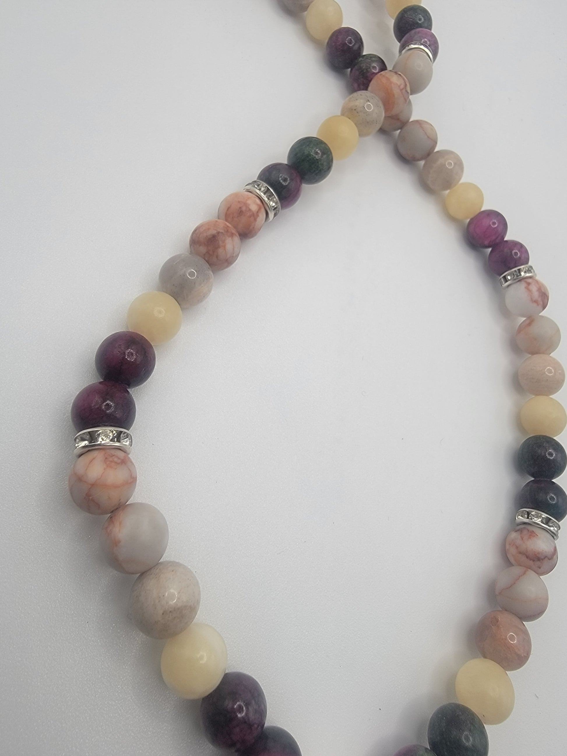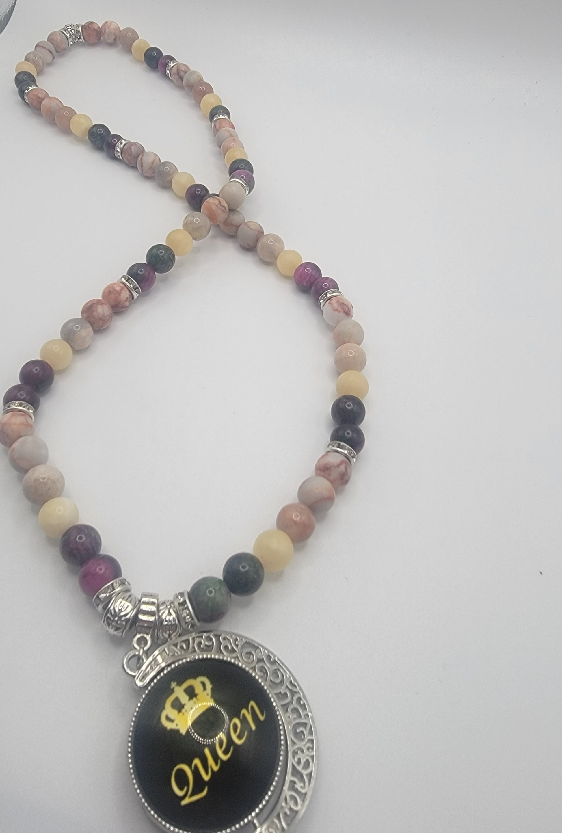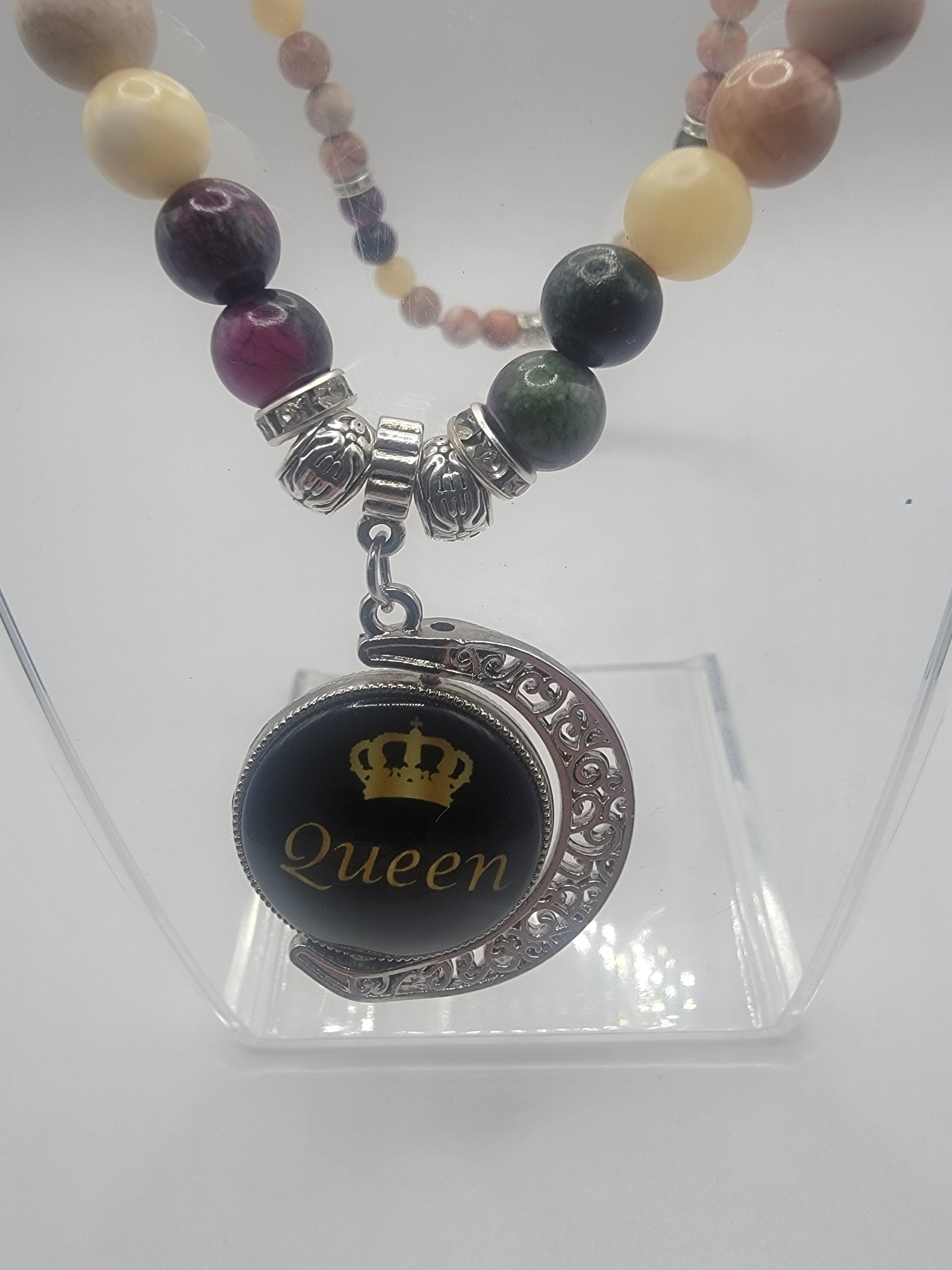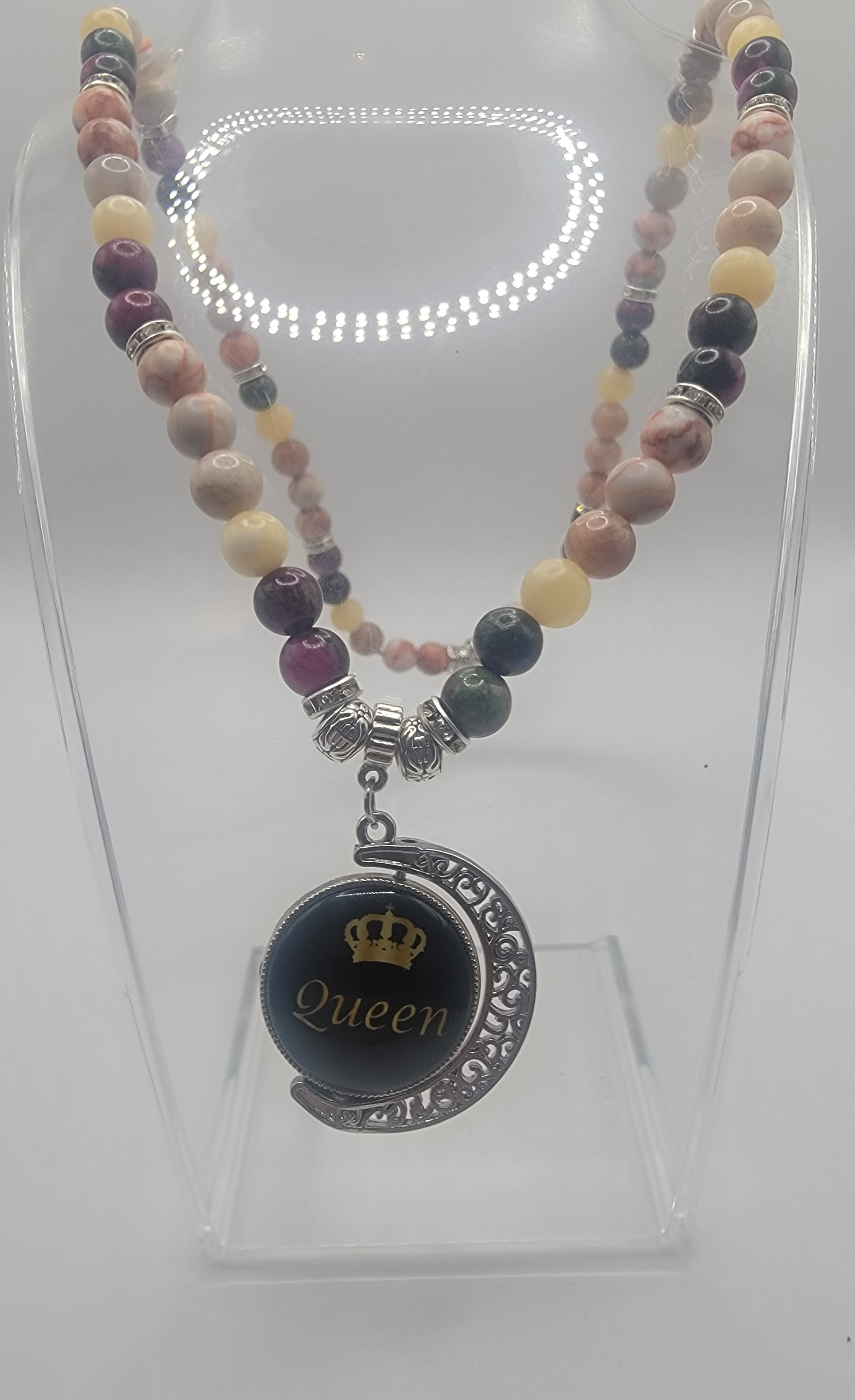 Red Vein Jasper, Yellow Jade, Sunstone, and Purple & Green Jasper with Queen turning pendant.