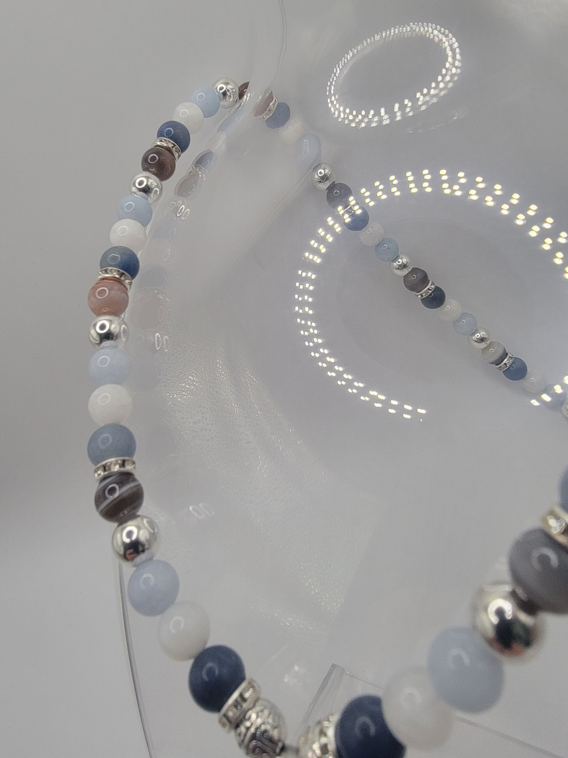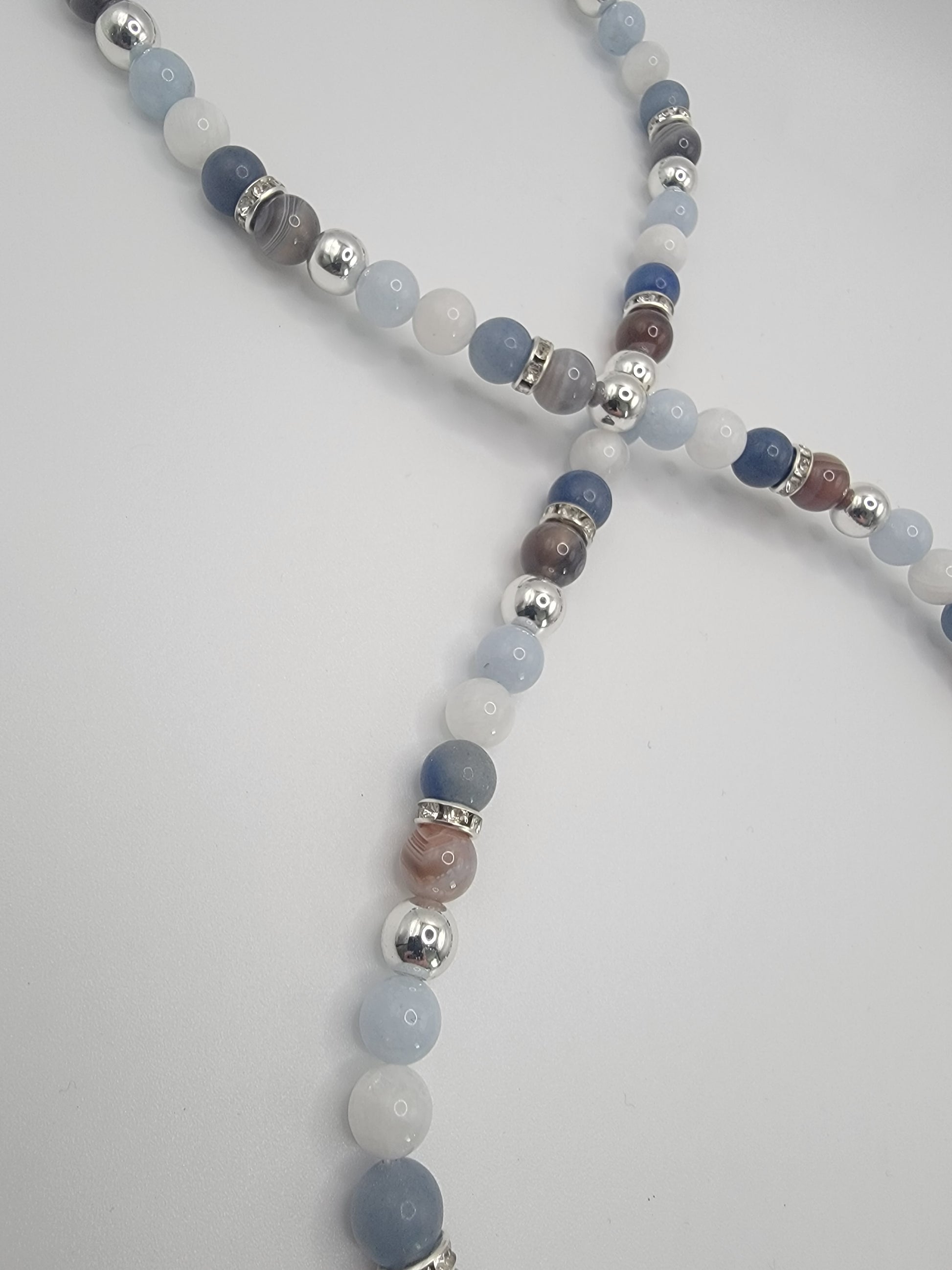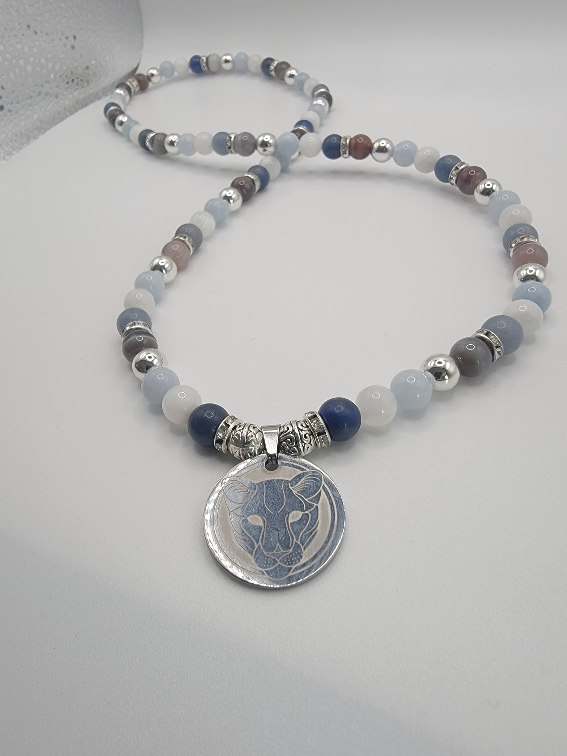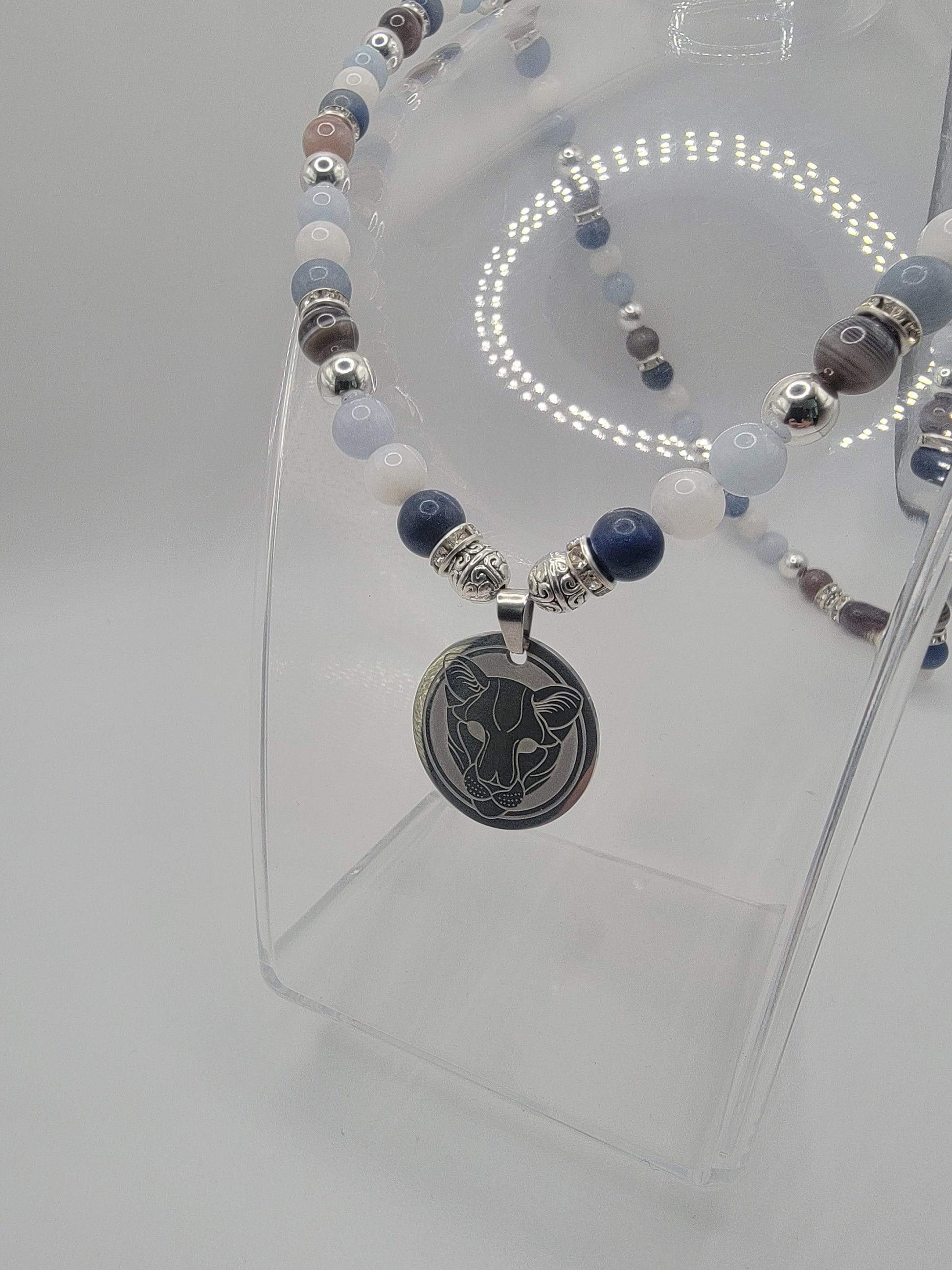 Botswana Agate, Silver Hematite, Aventurine, and Angelite with lioness pendant.