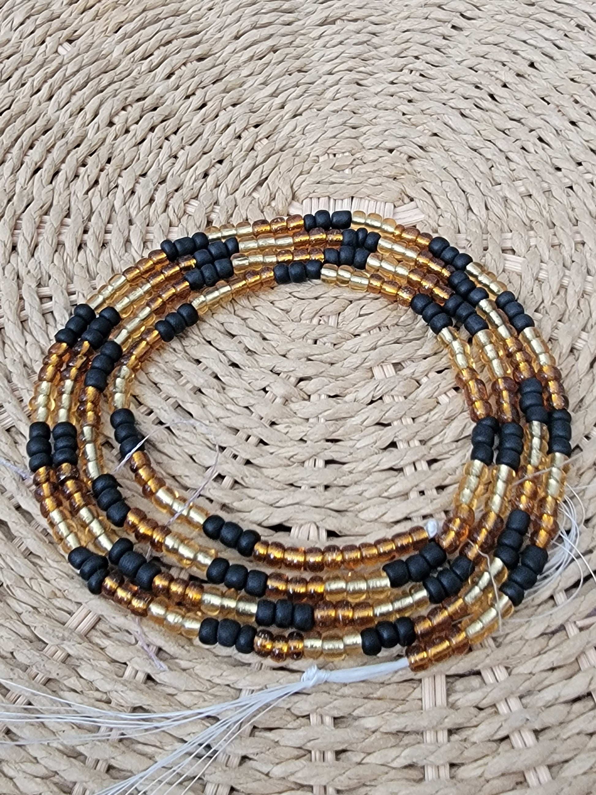 Sizing/Fit: size on your waist where comfortable, remove any excess beads, tie both ends together and trim thread