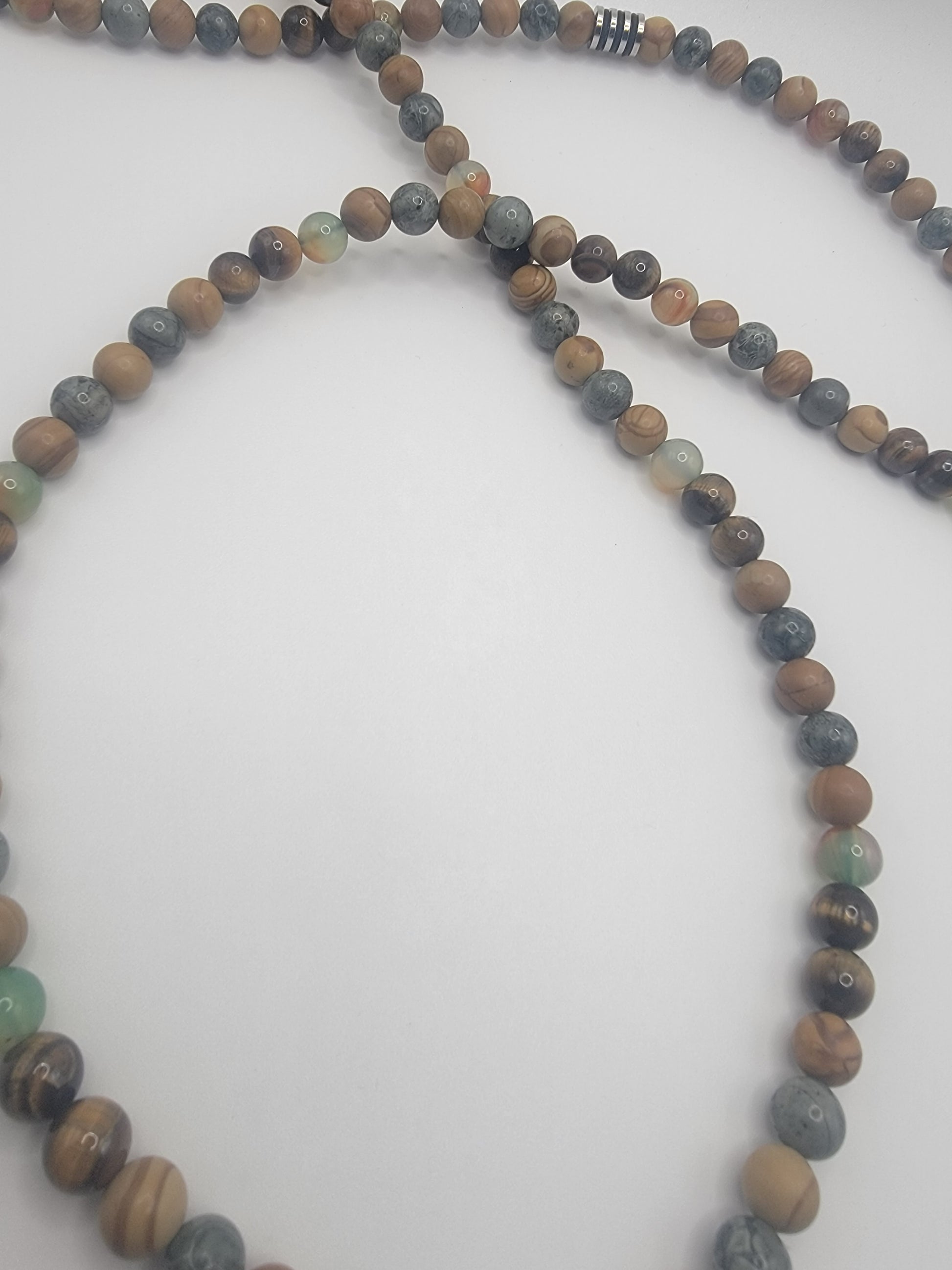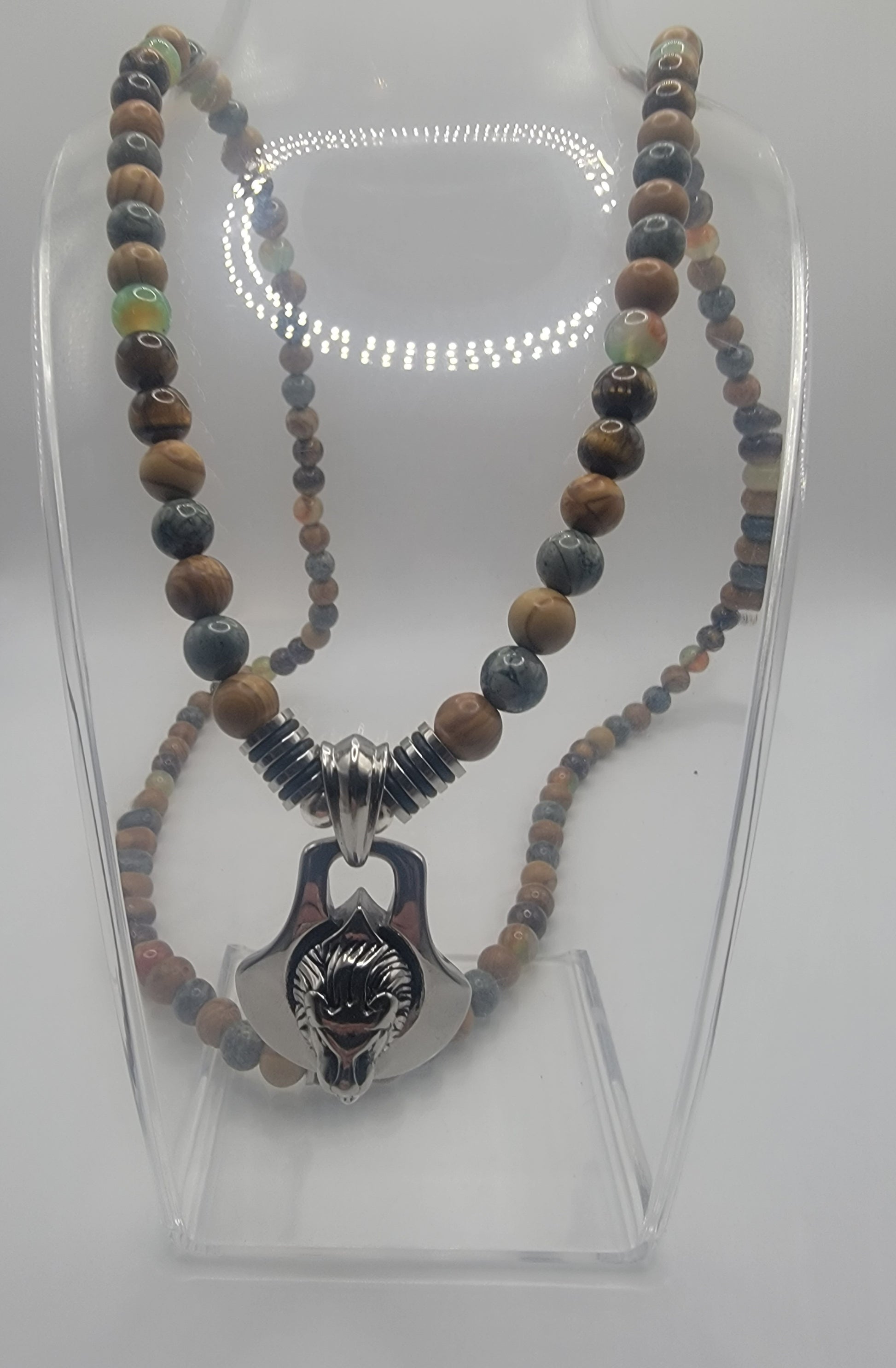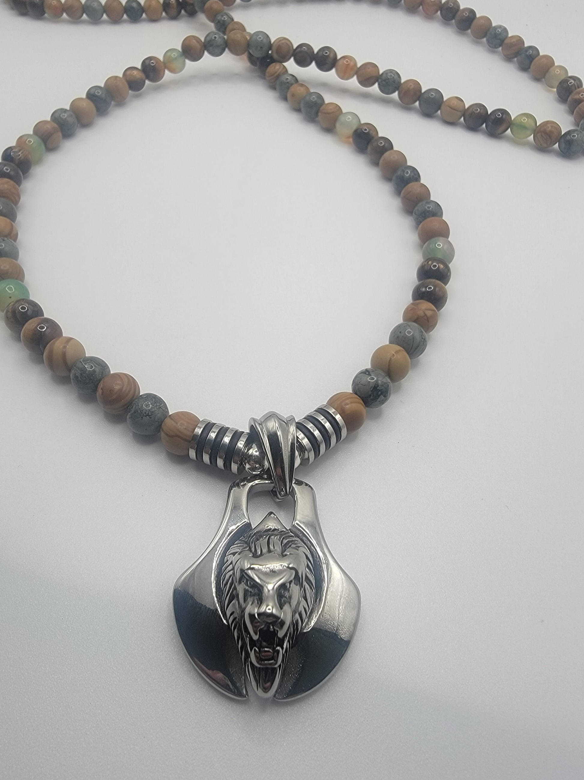 Wood Grain Jasper, Tiger's Eye, Peacock Agate, Green Brecciated Jasper with Stainless Steel Lion Head Pendant.
